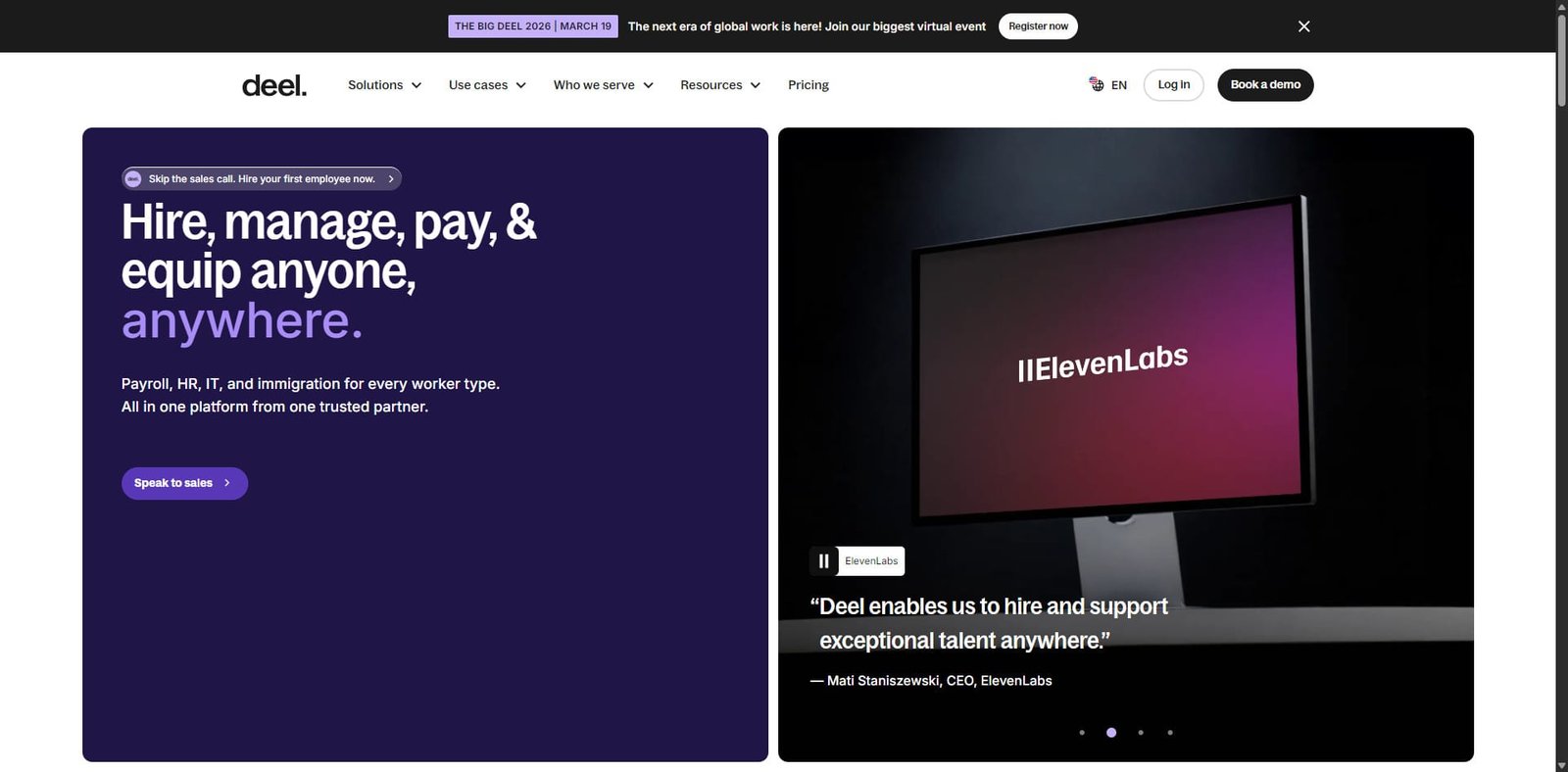 Deel is a leading global payroll and compliance platform designed to help companies hire, onboard, and pay employees and contractors across multiple countries. It simplifies international hiring by handling local labor laws, tax compliance, payroll processing, and contractor payments through a unified platform.