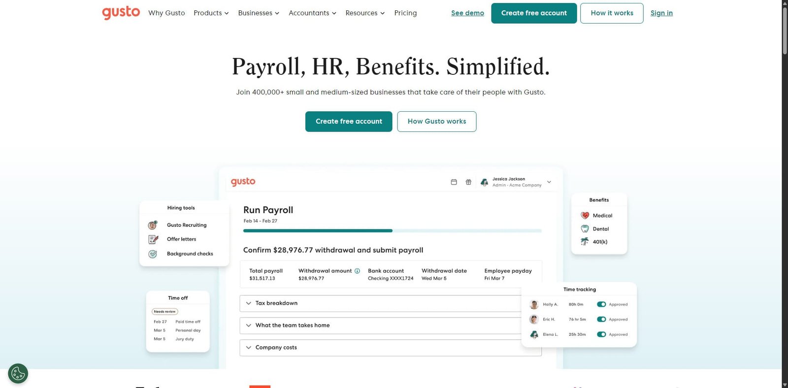 Gusto is a cloud-based payroll and HR platform built primarily for small and medium-sized businesses. The platform simplifies payroll processing, tax filing, employee onboarding, and benefits administration through a clean, easy-to-use interface.